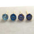 【品名】 4mmラウンド4本爪・スタッドピアス(立て爪ピアス)・czキュービックジルコニア(カラー・ブルー系)「ゴールドフィルド」 【材質】 14Kゴールドフィルド【14/20K】 ・czキュービックジルコニア/4mm ・ポストの太さ:約0.7mm ・刻印:14KGF 左からアクアマリン・スイスブルートパーズ・タンザナイト・ブルーサファイア