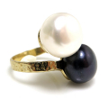 淡水パール(真珠)指輪リング/ハンマード(ボタン・ホワイト系+ダークブルー~ブラック系12mm×2)(真鍮ブラス・ゴールドカラー)(1個)です。