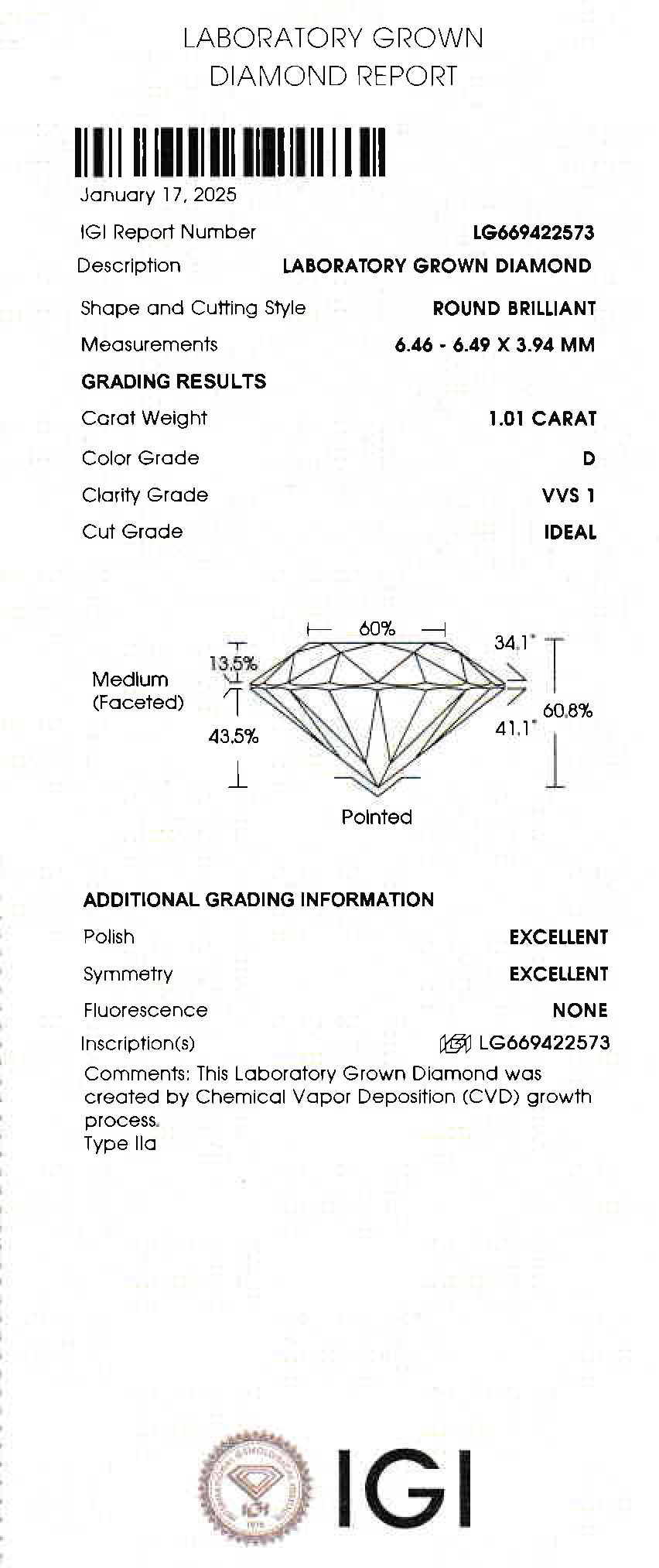 IGIの鑑定書(ラボラトリーグロウンダイヤモンドレポート)が付属します。