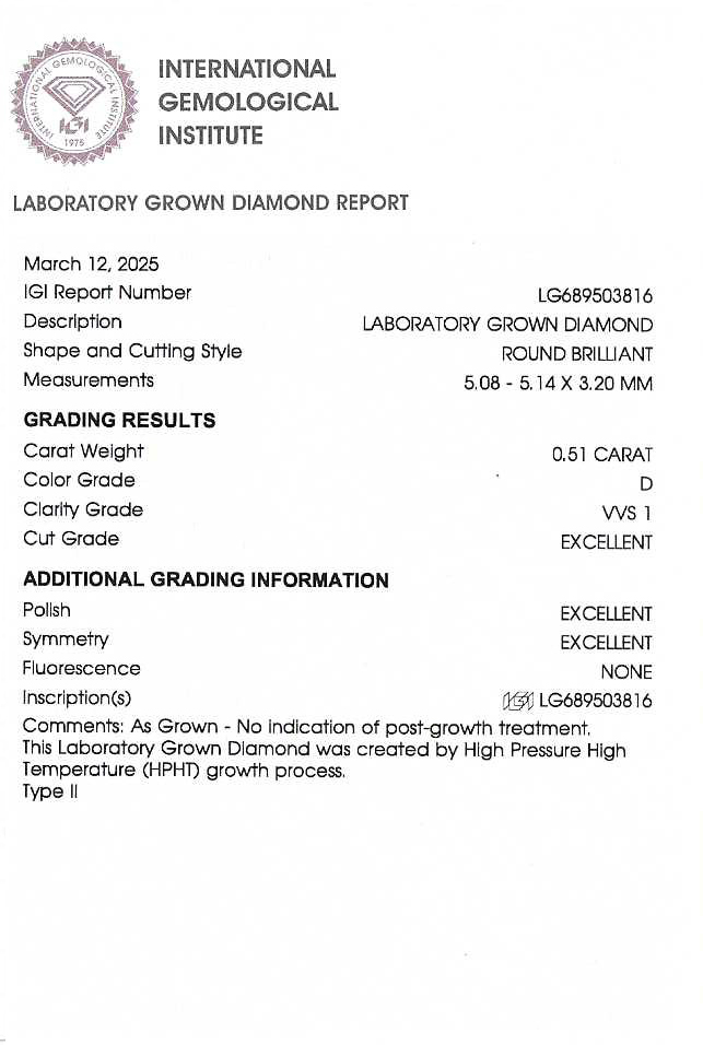 0.51ct-D-VVS1-3EXラボグロウンダイヤモンドルース(IGI鑑定書付)ラウンドブリリアントHPHTです。