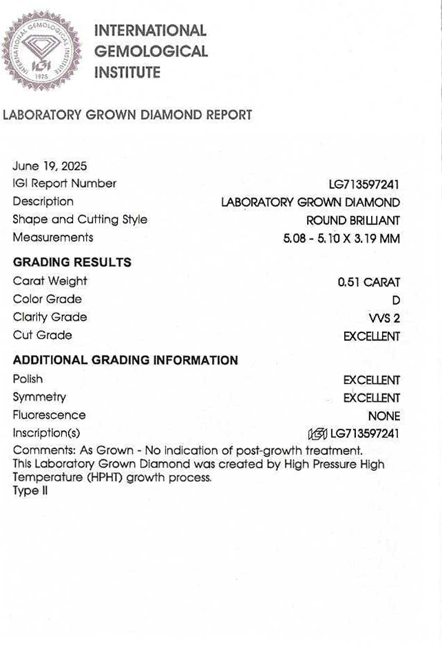 IGIの鑑定書(ラボラトリーグロウンダイヤモンドレポート)が付属します。