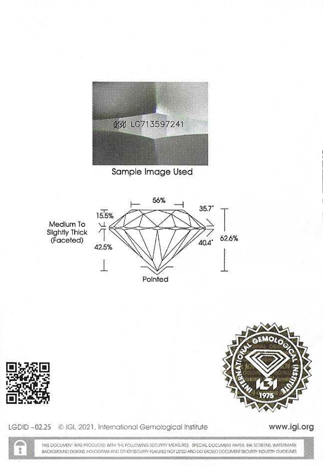 IGI鑑定書番号の刻印は、特定のIGI鑑定書のデータとルースを紐付けしたセキュリティ機能です。