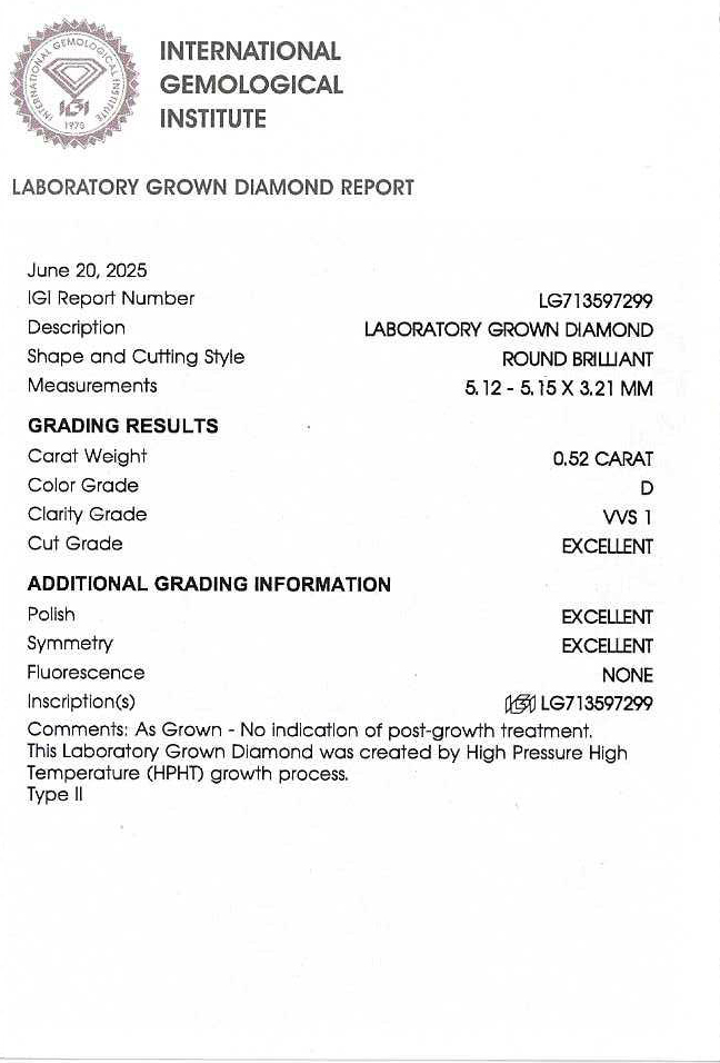 0.52ct-D-VVS1-3EXラボグロウンダイヤモンドルース(IGI鑑定書付)ラウンドブリリアントHPHTです。