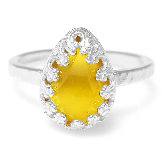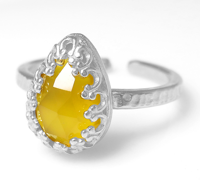 イエローカルセドニー(染) リング指輪 天然石(カボション ローズカット ペアシェイプ・10×7mm)(真鍮ブラス・シルバーカラー)