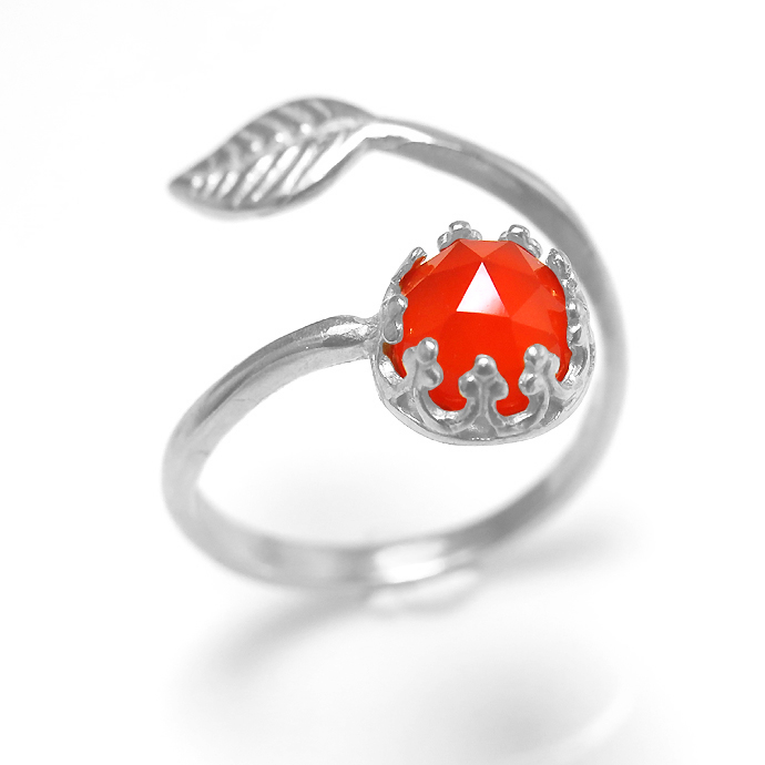 カーネリアン指輪 リング 天然石<7月誕生石>・ローズカット指輪リング・リーフ(ベゼルカボションラウンド・6mm)(真鍮ブラス・シルバーカラー)(1個)