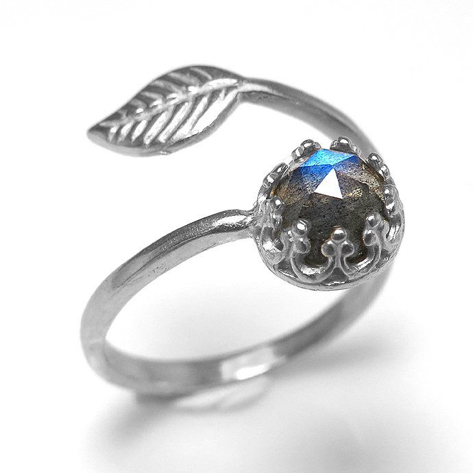 ラブラドライトリング 指輪 ローズカット リーフ(ベゼルカボションラウンド・6mm)真鍮ブラス・シルバーカラー(1個)