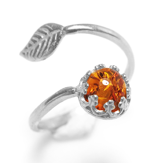 琥珀 指輪 バルト海沿岸部 指輪リング・リーフ(ベゼルカボションラウンド・6mm)(真鍮ブラス・シルバーカラー)(1個)