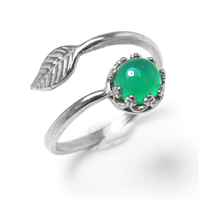 グリーンオニキス 指輪 天然石リング・リーフ(ベゼルカボションラウンド・6mm)(真鍮ブラス・シルバーカラー)(1個)