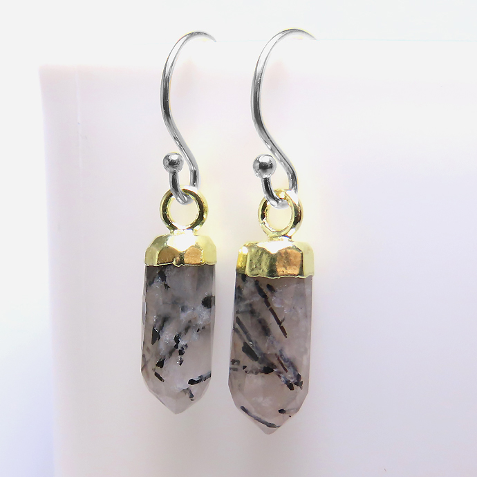 ブラックルチルクオーツ 天然石ピアス 16×5mm ポイント ドロップ・フレンチフック コンビミックスシルバー